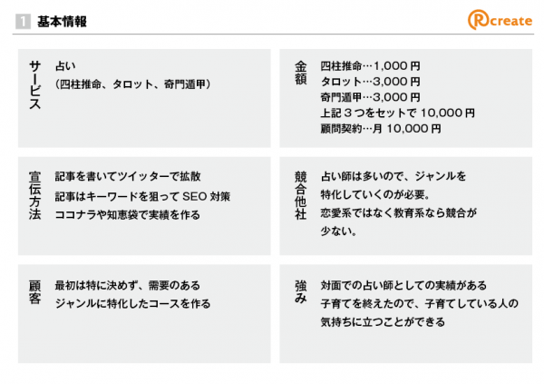 顧客…あなたの商品やサービスのターゲットです。ここは、初めて見るとずれることがあります。例えば20代女性向けの恋愛占いを得意としていても、実際に来る顧客が50代のセカンドライフで恋愛を楽しみたい男性の場合もあるからです。